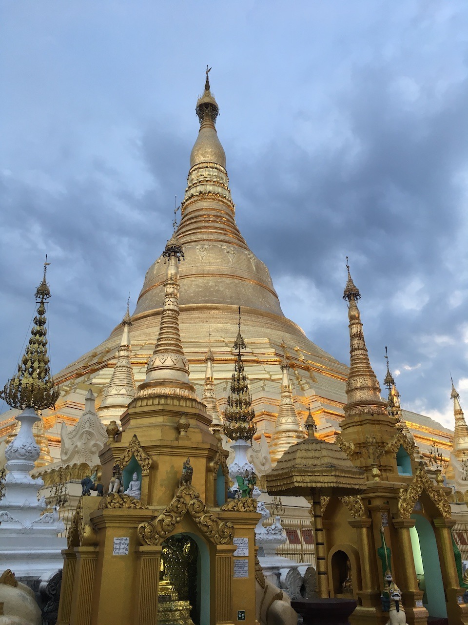 Despite my jaded comments about temple burn-out, Shwedagon Pagoda is indeed magnificent. It was made more so by the dark afternoon thunderclouds that threatened, but did not strike. The golden spire seemed to pierce through the heavy, sultry clouds, shining ever the brighter. We lingered long, circling the pagoda barefoot to make merit for the day.